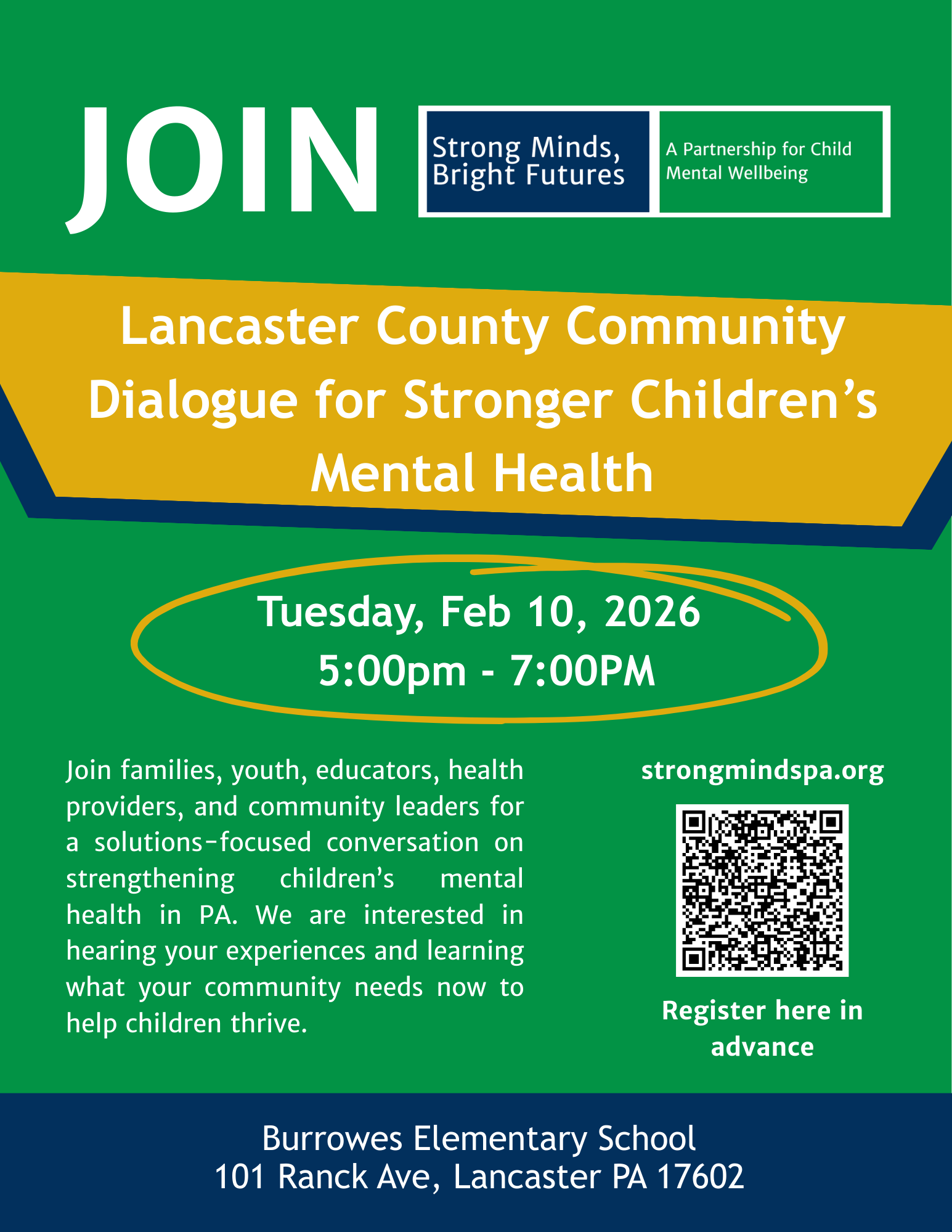 Strong Minds, Bright Futures is hosting a Community Dialogue on youth mental health in Lancaster, and we want to hear directly from young people, families, educators, providers, and community leaders.