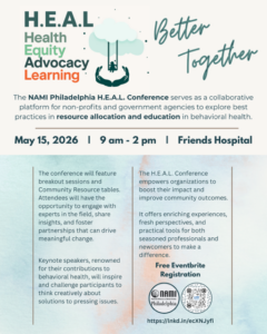 H.E.A.L. Conference: Better Together – NAMI Philadelphia May 15, 2026 9:00 am - 2:00 pm NAMI Philadelphia LTaylor@namiphilly.org View Organizer Website Affiliate Event View Events WebsiteAdd To CalendarGoogle CalendarApple CalendarExport .ics fileOutlook LiveOutlook 360